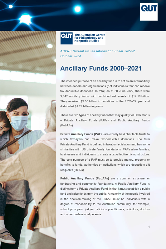 Posted on Nov 8 2024 By Marie Balczun Mcgregor-Lowndes, Myles, Balczun, Marie, Williamson, Alexandra (2024) Ancillary Funds 2021-2022: ACPNS Current Issues Information Sheet 2024-2View on ePrints