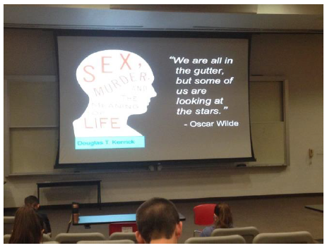 - According to Sapolsky,“Kenrick writes like a dream”, and Pinker names Kenrick as one of the most important scientists studying the evolutionary shaping of human drives and emotions. The titles of the book chapters are appealing: Standing in the Gutter; Why Playboy Is Bad for Your Mental Mechanism; Homicidal Fantasies; Outgroup Hatred in the Blink of an Eye; The Mind as a Coloring Book; Subselves; Reconstructing Maslow’s Pyramid; How the Mind Warps; Peacocks, Porsches, and Pablo Picasso; Sex and Religion; Deep Rationality and Evolutionary Economics; Bad Crowds, Chaotic Attractors, and Humans as Ants. Steve visited Kenrick recently in Arizona and can give you more insights into Kenrick’s mind and personality (below he attended his lecture).