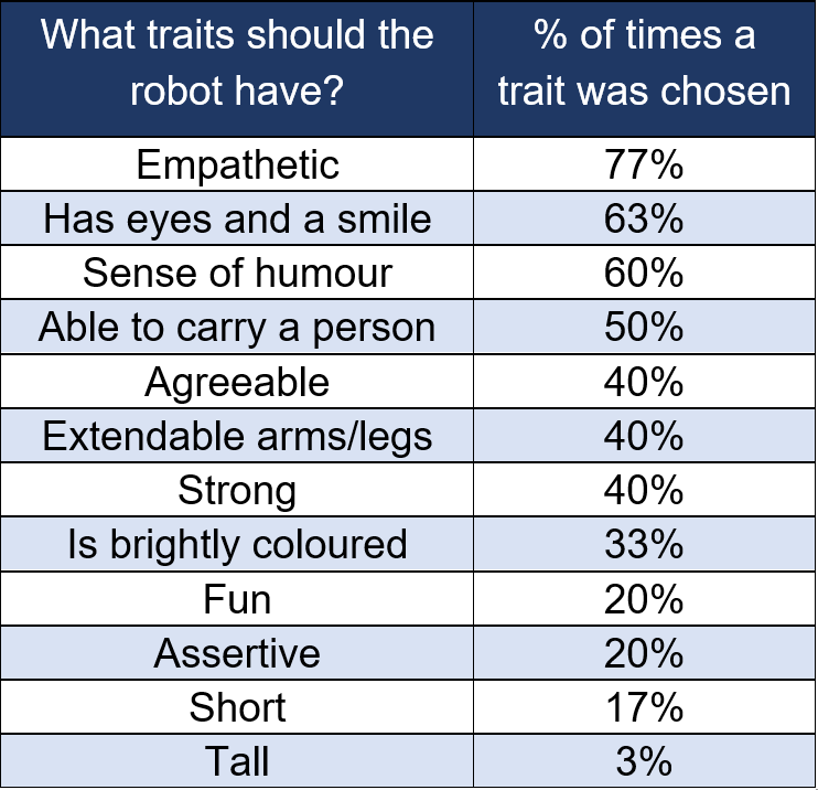 During the presentation, Dr Letheren asked attendees to imagine they were designing a robot to assist older people with mobility. Attendees were given 12 traits and asked to choose ones that they thought the robot should have (they could choose multiple traits). In line with rule 1, attendees tended to select amiable traits, such as empathetic (77%), and agreeable (40%), over more directive and powerful traits, such as assertive (20%) and tall (3%).