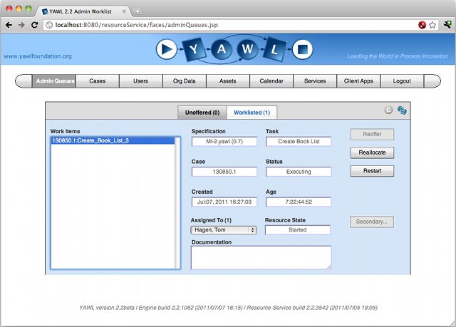 YAWL (Yet Another Workflow Language) is a Business Process Automation and Management System, based on a concise and powerful modelling language, that handles complex data transformations and full integration with organisational resources, external systems and Web Services. The formal foundation of the YAWL language makes its specifications unambiguous and allows for automated verification.