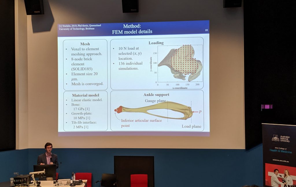 Our postdoctoral research fellow, Dr Edmund Pickering gave a podium presentation entitled, “Load sensitivity in the mouse tibia loading model: Insights through coupled experiments and modelling.”  Edmund’s research focuses on bone-adaptation, and how bone responds to load. By studying the mouse tibia, researchers can gain important insights into diseases like osteoporosis as well as how the body responds to implants.