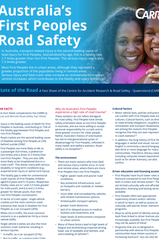 Posted on Jul 25 2022 By Amy Schramm (2021) Australia's First Peoples Road Safety Fact Sheet. CARRS-Q.View publication
