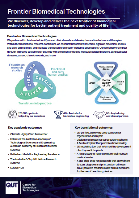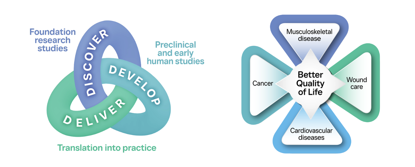 We partner with clinicians to identify unmet clinical needs and develop innovative devices and therapies. Within the translational research continuum, we conduct fundamental research, rigorous preclinical studies and early clinical trials, and facilitate translation to clinical or industrial applications. Our work delivers impact through improved outcomes for patients with conditions including musculoskeletal disorders, cardiovascular diseases, cancer, chronic wounds, and more.