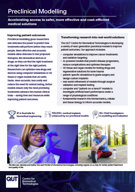 Preclinical modelling gives researchers and clinicians the power to predict how treatments will perform before they reach people. More effective and accurate models allow clinicians to test proposed therapies, like biomedical devices or drugs, so they can find the right treatment at the right time for the right patient. Researchers can optimise new drugs and devices using computer simulations or 3D tissue or organ models that are safer, faster, more accurate, less costly and reduce the need for animal testing. Better models ensure only the most promising treatments advance into human clinical trials – saving time and resources while improving patient outcomes.