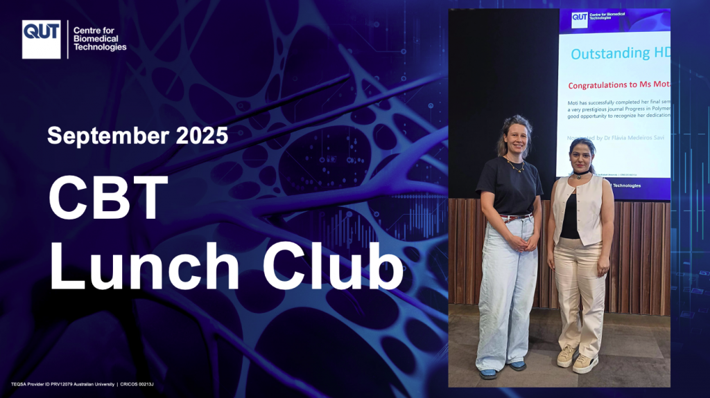 Prof Li talked about the QUT Cardiovascular Technology Laboratory. Dr Welsh, one of our Early Career Researchers, shared his experiences on how to connect with industry, and PhD student, Pouya Rajaee, talked about his research on Bioinspired scaffolds for bone tissue engineering. We also announced CBT’s HDR of the Month for August 2025.