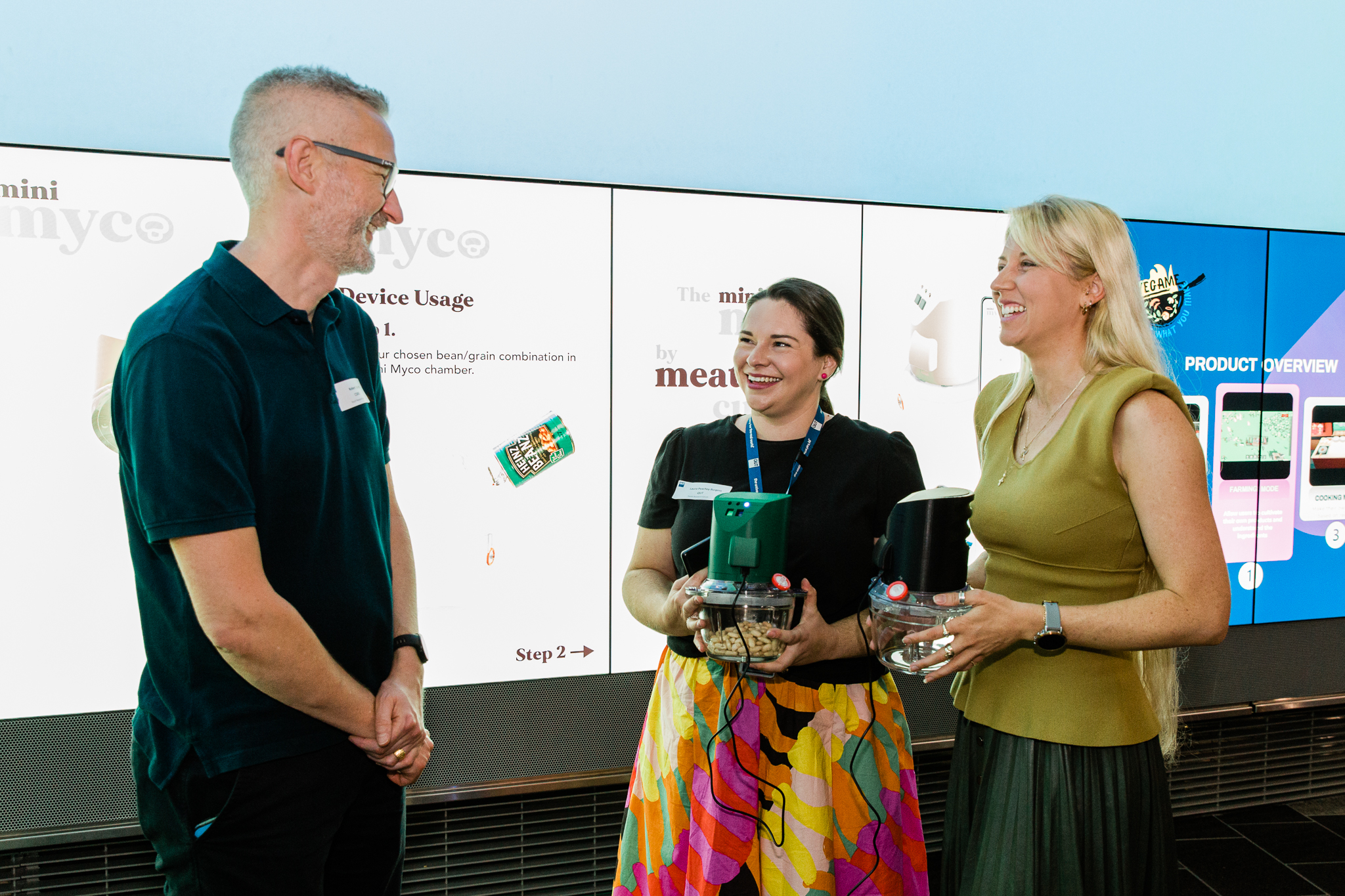 The Mini Myco is operated through a mobile application that consumers can use to ‘set and forget’, however, if they’re feeling adventurous, they might like to experiment. The beauty of the Mini Myco is that it allows consumers the freedom to experiment with flavour profiles through the use of different beans and grains, as well as growing methods (variable temperatures and growing time). All of this data is collected, and the user can share their ‘recipe’ with others through the mobile application. This online community creates the ability to crowd-source methods for other consumers to try and rate. We were able to build two working prototypes to grow tempeh (the mycoprotein strain will take 9 months to arrive so we haven’t tested this yet). It was just Lauren and I on the team, however, we were always working in collaboration with the other 4 teams at QUT. We also had a day when high school students from the QUT STEM Camp came to see us and evaluate our product ideas. We outsourced the development of the mobile application as well as the building of some of the appliance hardware. Lauren designed the shell of the Mini Myco which we were then able to 3D print.