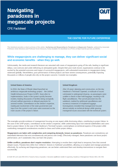While megaprojects are challenging to manage, they can deliver significant social and economic benefits – when they go well.Unfortunately, the media and research literature are saturated with cases of megaprojects going off the rails, leading to significant delays, cost overruns and under-delivering on anticipated goals. Despite their poor track record, organisations continue to be excited by the potential outcomes and impact of successful megaprojects, with substantial investments in megaprojects being witnessed globally. Nevertheless, poor performance of these projects can have severe consequences, potentially impacting thousands or millions of people who rely on the project outcome. As megaprojects involve multiple stakeholders across various sectors and deliver novel and complex solutions, they often require decision makers to deal with persisting tensions to balance conflicting demands. Hence, it is critical to pay attention to paradoxical tensions – contradictory and interrelated elements of the project that persist over time. This research project catalogues categories of paradoxical tensions in megaprojects and outlines approaches to managing these tensions. Project Lead: Associate Professor Anna Wiewiora | a.wiewiora@qut.edu.au _________________ Access the full research paper