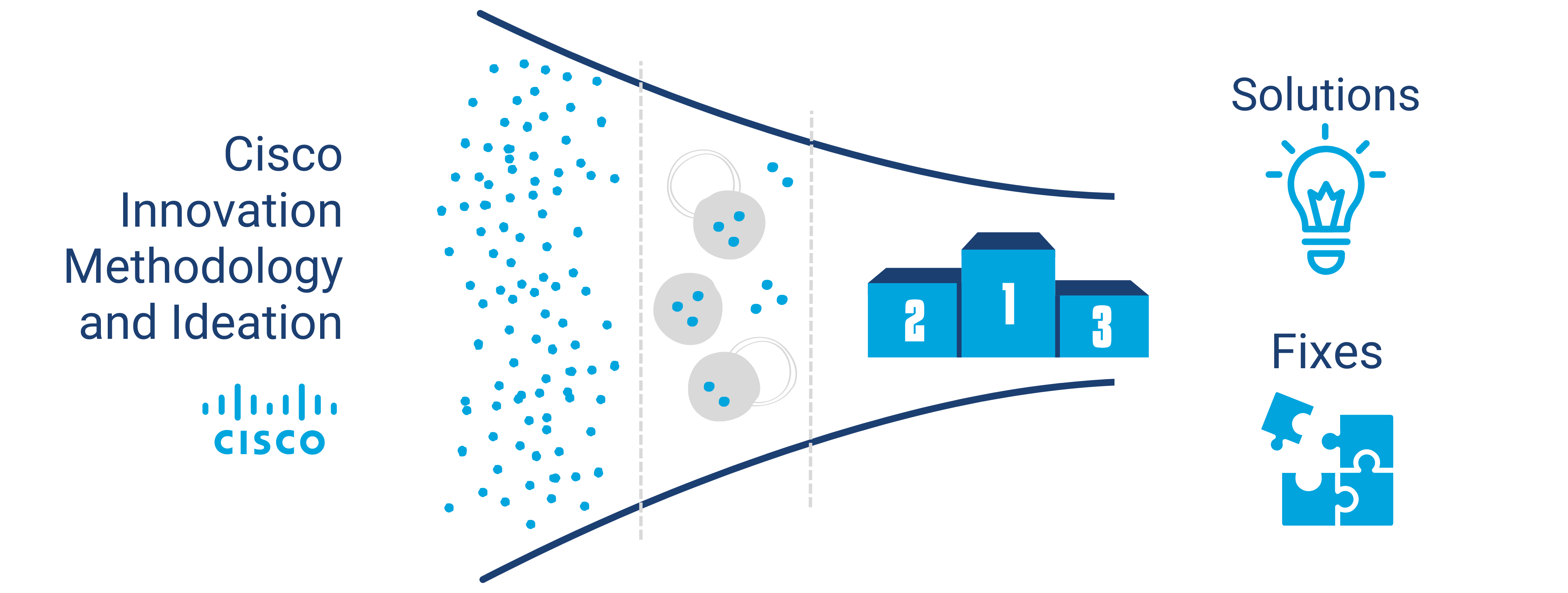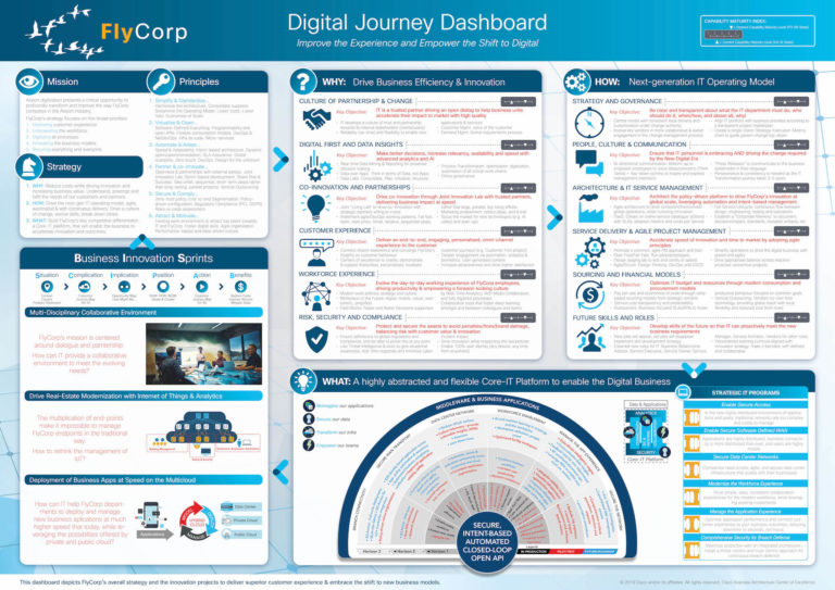 Cisco Business Architects work with customers to create a CxO-level, one-page strategy called “Digital Journey Dashboard” (DJD). The DJD is a large infographic that depicts the way your organisation’s strategic business drivers (the ‘why’) connect to your next-gen IT operating model (the ‘how’) and to the multi-domain architecture that will accelerate your business innovation (the ‘what’). It balances the long-term, structural transformation initiatives (the ‘marathon’) with “Business Innovation Sprints” focused on delivering tangible & visible value to the business.