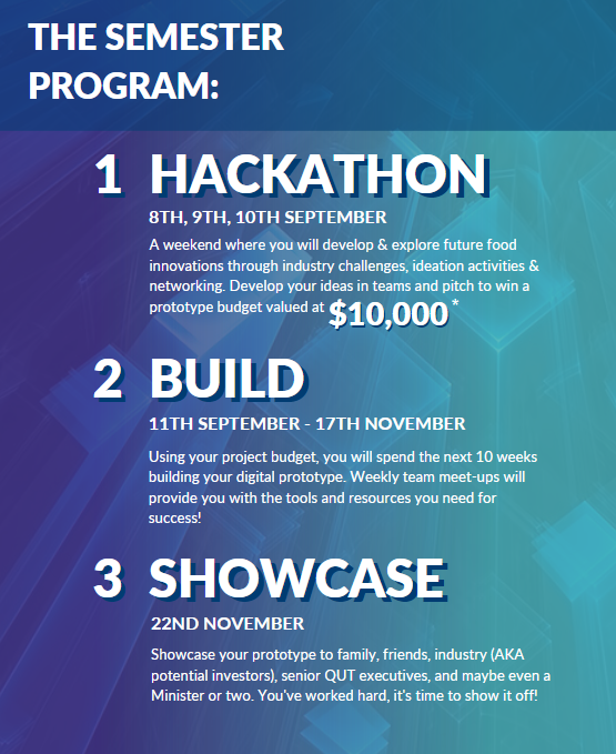 Join industry leaders and design thinking experts to explore how technology might unlock sustainable supply chains for future food. Develop your ideas, and pitch to win a project budget of $10,000 at the QUT Youth Research Forum Hackathon. The Youth Research Forum kicks off with a weekend Hackathon on 8th, 9th & 10th of September, and concludes with an industry showcase on 22nd November 2023*.