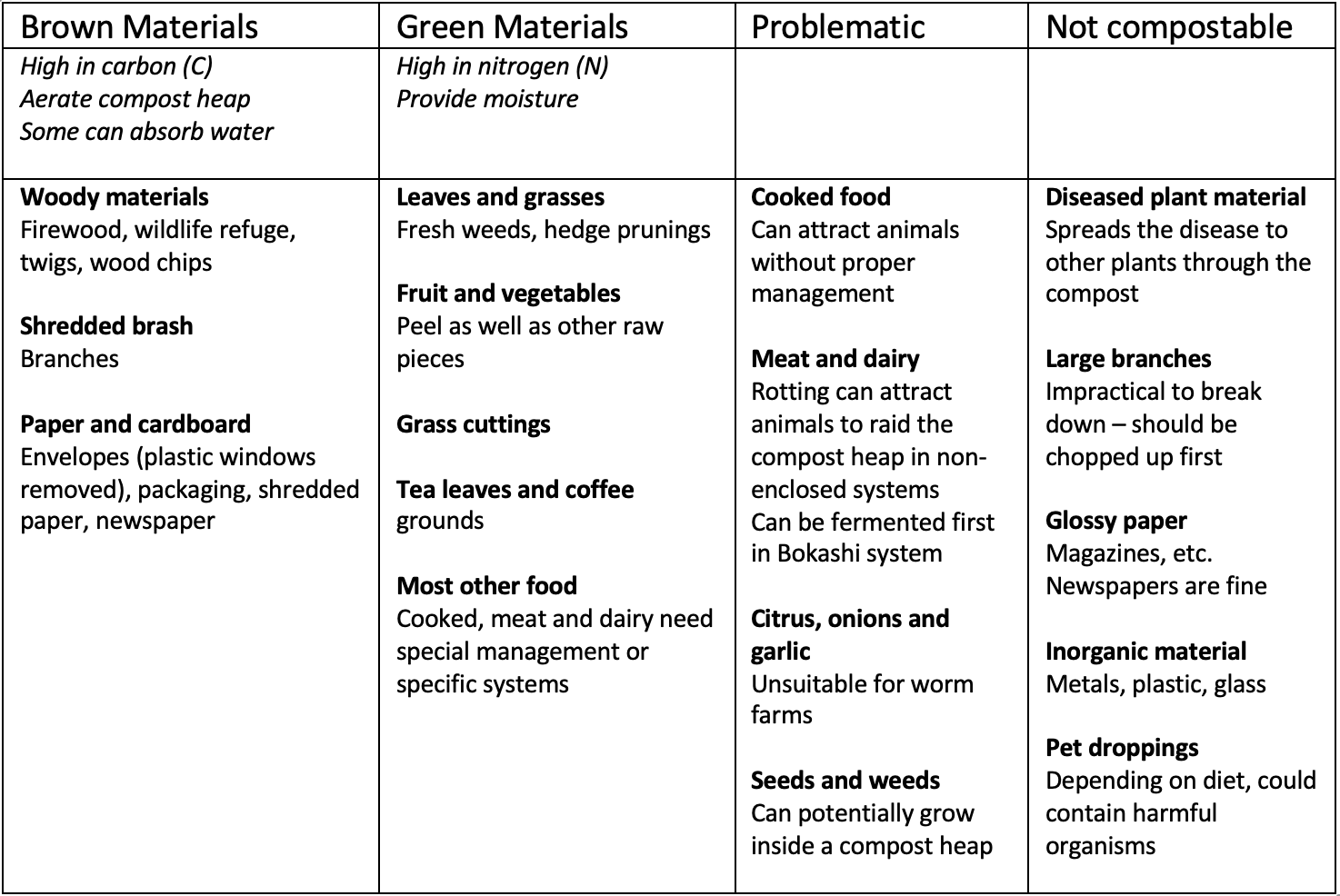 - Too wet – lack of oxygen, compost turns anaerobic while emitting foul odours;