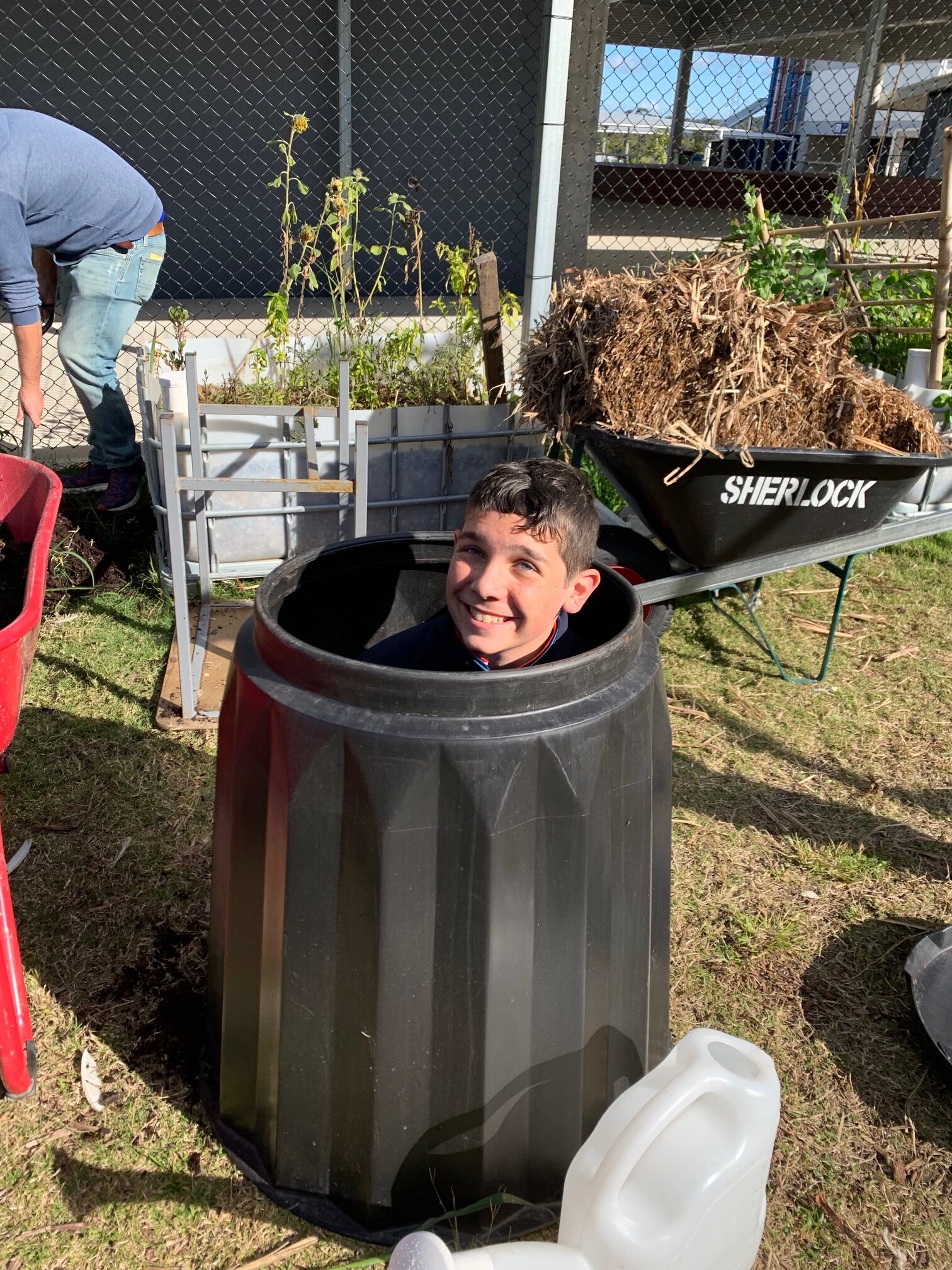 The pictures below show a selection of different compost bins around the school yard at Yarrabilba SSC, including a tumbler and regular compost bins of various sizes. We’ve also included some photos of the YSSC students’ antics with the bins!