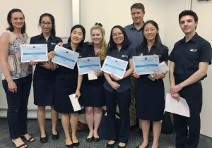 Research on lid wiper epitheliopathy received a coveted first prize award at the QUT Postgraduate Masters of Optometry Project Presentation on Thursday, 26 October 2017. The team included supervisors, Professor Michael Collins (pictured back row) and Dr Alyra Shaw (pictured far left), along with the student group, from left to right: Grace Lee, Zion Kim, Ashleigh Casey, Huu My Phuong Nguyen, Justine Huang, and Joshua Johnstone. Each student received a $50.00 book voucher from the QLD & NT Optometrists Association of Australia.