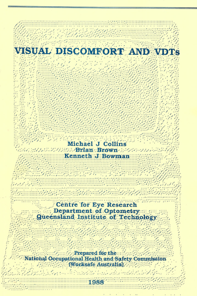 Posted on May 2 2017 By Catherine Foster Michael J Collins, Brian Brown, Kenneth J Bowman. (1988) Visual Discomfort and VDTs. National Occupational Health and Safety Commission (Worksafe Australia). [QUT ePrint Record will be available shortly].