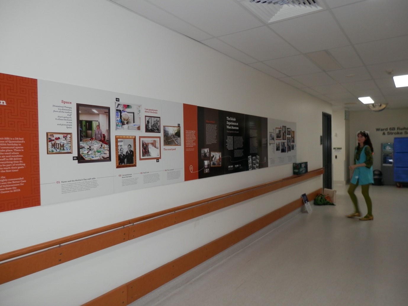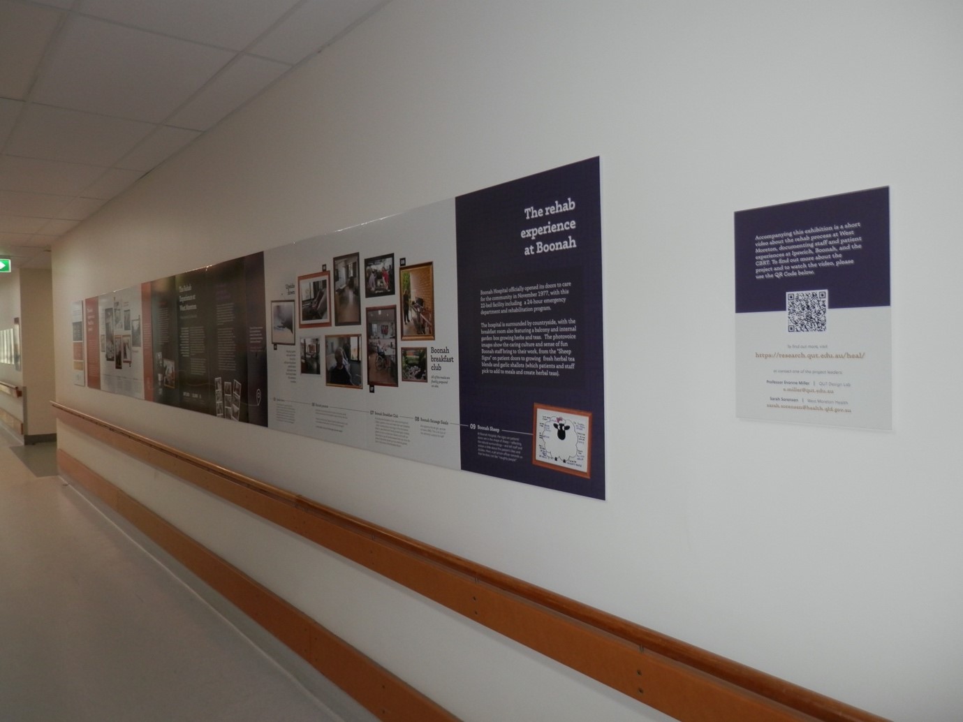On 7 June, Professor Evonne Miller, Dr Abbe Winter, and HDR Interns Jessica Cheers and Zoe Ryan from the QUT Design Lab went out to Ipswich Hospital to install an exhibition as the culmination of a six-month project into improving the rehabilitation experience across the West Moreton Hospital and Health Service. Following a co-design workshop with staff and customers of the rehabilitation process facilitated by Professor Evonne Miller and HDR Intern Sarah Johnstone, staff and patients were invited to take photographs and describe various aspects of their rehab journey. All of these resources were used to create the exhibition, which is showing outside Ward 6B (Rehabilitation) at Ipswich Hospital and is also on display at Boonah Hospital.