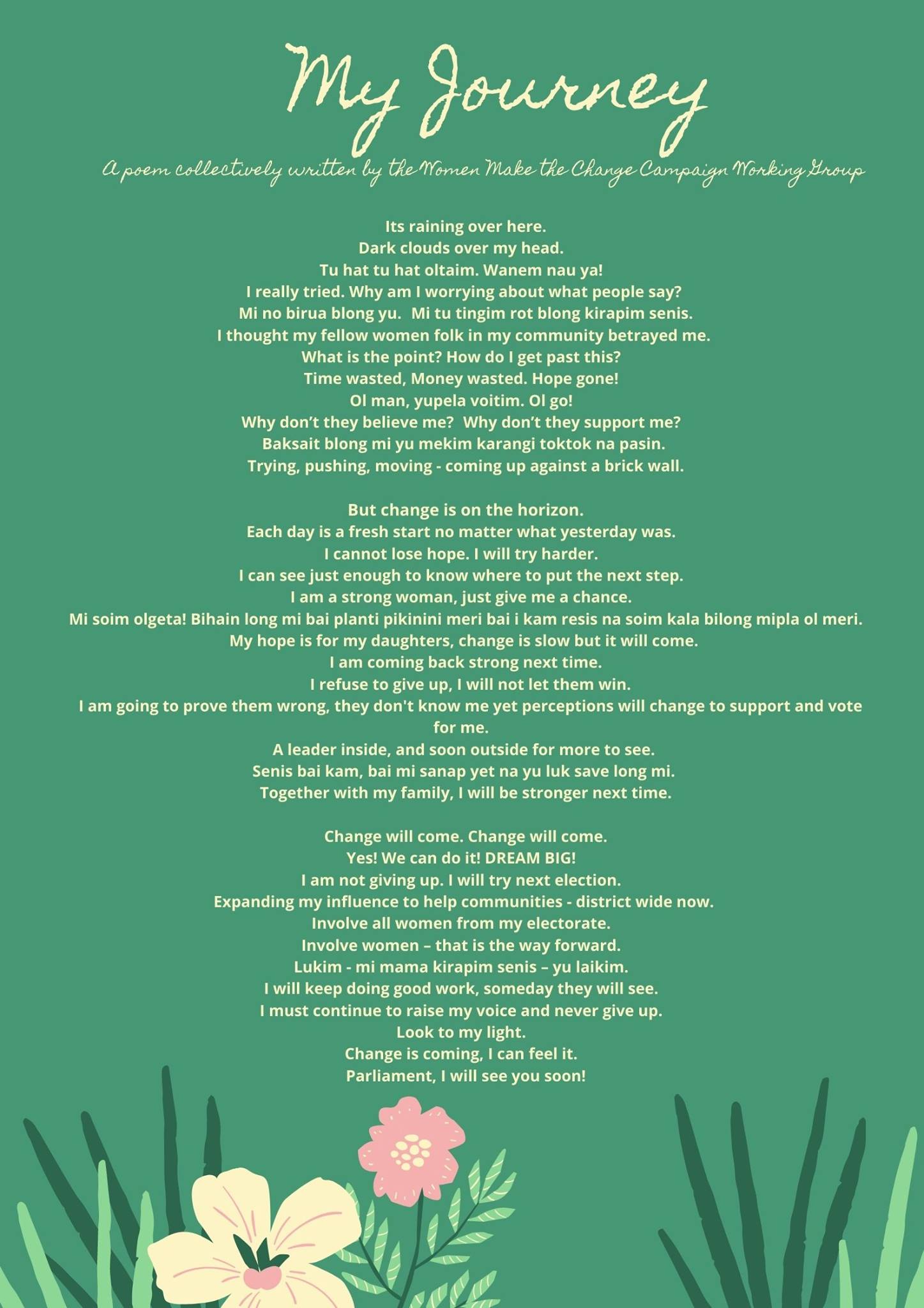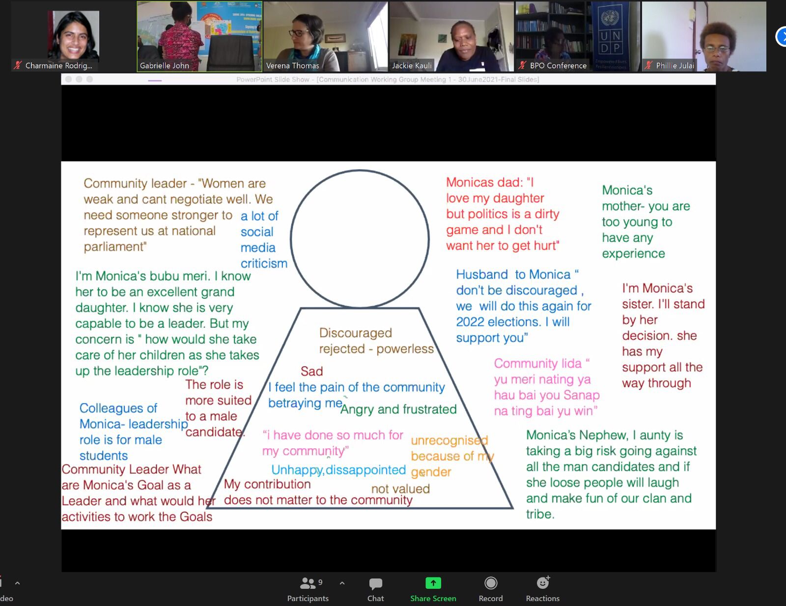 As part of the introductory meeting, the group discussed some of the narratives and perceptions related to women’s leadership in PNG. Through a collective exercise, working group members also co-created a poem on women’s political leadership titled ‘My Journey’, which you can read here.
