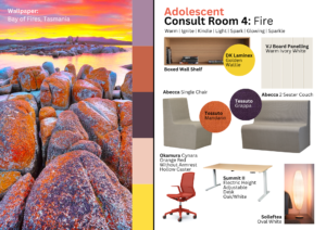 - Consult Rooms: Four consult rooms, including one dedicated to consultations with adolescents, were reimagined to evoke specific sensory experiences inspired by the elements of water, earth, air, and fire. Each room is designed to foster feelings of tranquillity, grounding, lightness, and warmth, respectively.