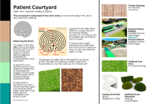 - Patient Courtyard: The patient courtyard is a therapeutic oasis featuring an interactive labyrinth that promotes healing and balance. The labyrinth, a symbol of wholeness and mindfulness, offers patients a meditative journey to their centre and back, contributing to their overall well-being.