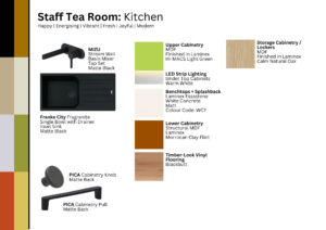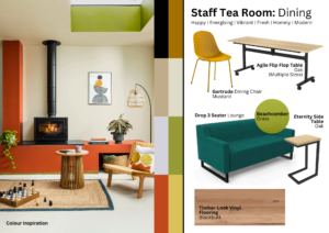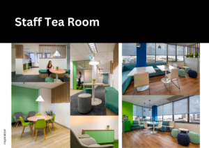 - Staff Tea Room: The staff tea room was designed to promote feelings of happiness, energy, and modern comfort, fostering a vibrant and rejuvenating environment for staff members.
