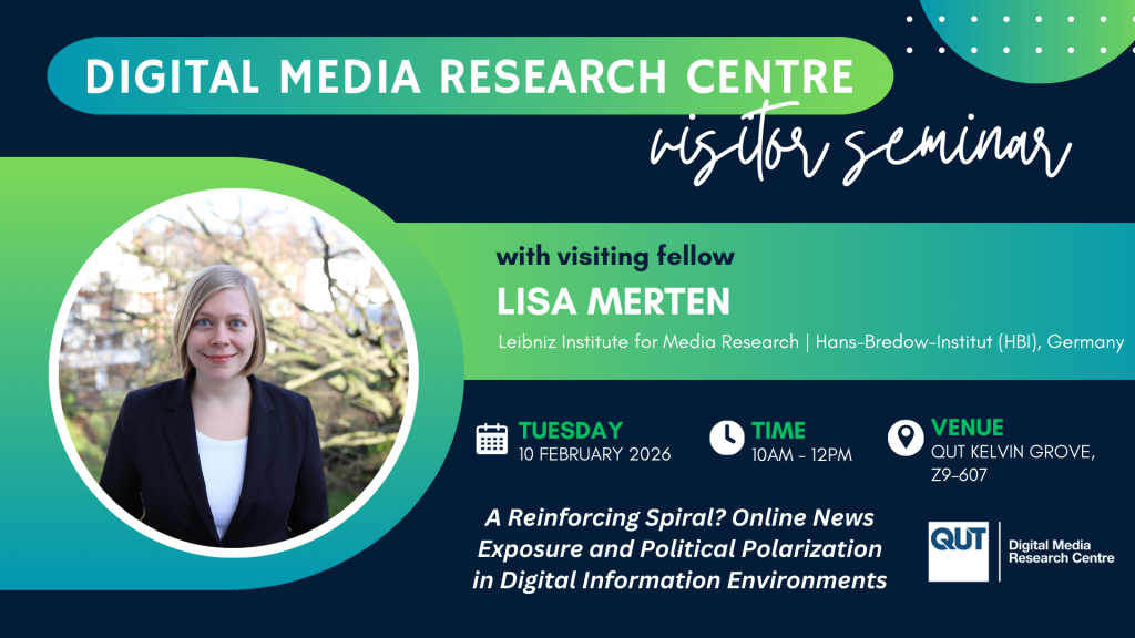 Join us at the upcoming DMRC Visitor Seminar on Tuesday 10 February, led by visiting fellow Dr Lisa Merten from Leibniz Institute for Media Research | Hans-Bredow-Institut (HBI), who will be introducing the collaborative research project POLTRACK – Political Polarization and Individualized Online Information Environments (2022–2027); presenting preliminary results; introducing the POLTRACK data infrastructure; and outlining opportunities for international collaboration.