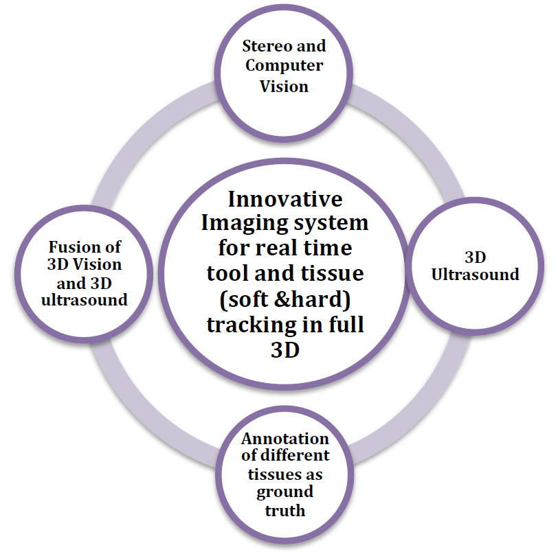 Despite the introduction of minimally invasive techniques to general surgery nearly 30 years ago, many of the more advanced surgical procedures are still too difficult to perform and require a steep learning curve. Limited dexterity and reduced perception have curtailed surgeon’s abilities to achieve comparable results to open surgery. Robot assisted surgery can drastically enhance the capabilities of a surgeon but to achieve its full potential real time tracking of surgical tools is highly desired for enhanced situational awareness. As tools become more dexterous and articulate, their pose tracking inside the body becomes more complicated. Although there are kinematic models available to describe tool motion, they tend to be too inaccurate to perform precise localization. Projects are available in this area, in collaboration with the Robotics and autonomous systems Department at QUT, to investigate how to solve the localization and tracking problem of surgical tools by development of advanced imaging devices and image processing algorithms via fusion of 3D vision and ultrasound imaging modalities. Towards this aim, the endoscopic video feed from a set of miniaturised stereo cameras in real time will be processed for 3D labelling of soft and hard (bone) tissue, as well as in identification of the standard visualisation planes of the surgical tools. 3D ultrasound transducers strategically placed outside the surgical area of interest will provide non-invasive external tracking and support a whole range of tissue typing/characterization applications.