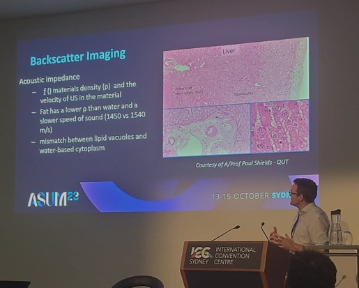 Technology such as UDFF can make a significant difference in quantifying the levels of fat in the liver, which in this case, can be displayed as simply as a percentage % fat. Chris’ presentation helped to clarify the concepts behind the technology, such as backscatter and attenuation. His work enables sonographers to better understand the technology they could work with and break down the barriers between research and clinical translation.
