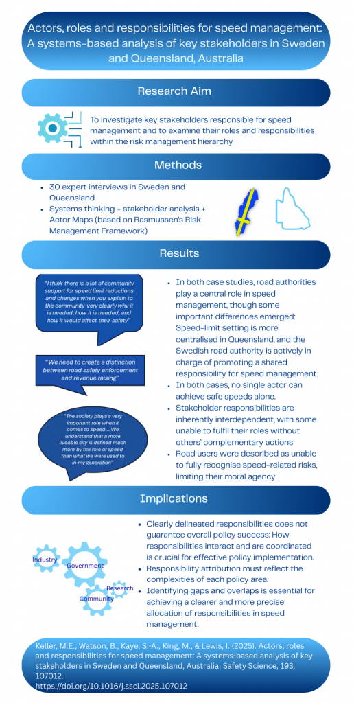 Keller, Maria Eugenia, Watson, Barry, Kaye, Sherrie Anne, King, Mark, Lewis, Ioni (2026) Actors, roles and responsibilities for speed management: A systems-based analysis of key stakeholders in Sweden and Queensland, Australia. Safety Science, 193, pp.Article number: 107012.