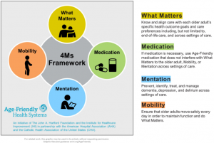 The Institute of Healthcare Improvement has a focus on creating age-friendly health systems in the United States. The IHI has identified four key guiding principles that recognise age friendly health services as a system where older people get the best possible care, experience no health-care related harms and are satisfied the health care they receive2. This is the “4 M” model: