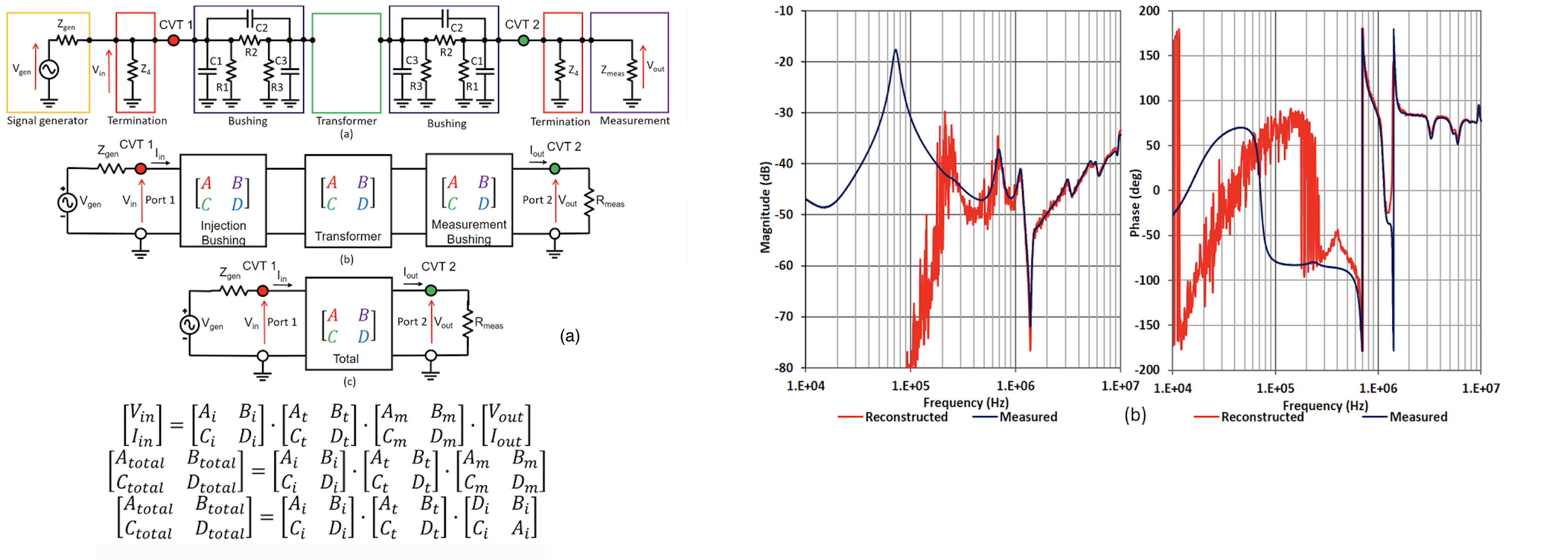 There is a need to be able to perform FRA on a transformer on-line in order to detect winding deformation. This will eliminate the need to take the transformer of-line to perform the test, and reduce the down-time necessary to preform the test. This needs to us a signal injection and extraction topology that can be connected to an energised unit permanently or when needed. Bushing taps available on capacitively graded bushings provides such a convenient signal injection and extraction points. It is therefore necessary to know what the addition of the signal injection and extraction paths via the bushing taps will do to the measured FRA signature. We thus produced a mathematical model of an online FRA measurement chain using transmission matrices. The model can be used to mathematically reconstruct the transformer winding spectrum.