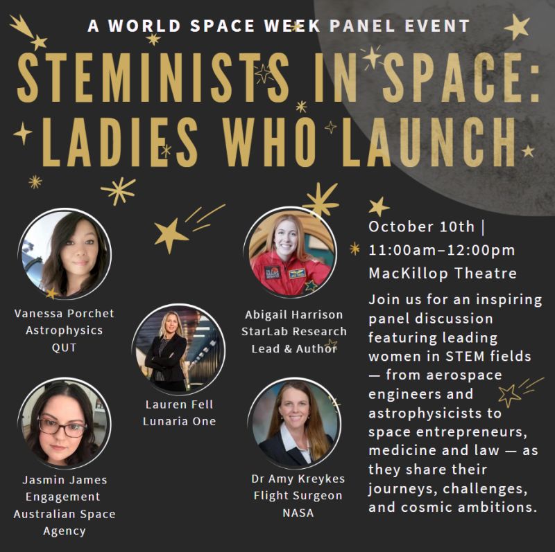 As part of their closing celebrations for World Space Week 2025, St Thomas More College hosted an inspiring all-female-identifying careers panel titled “STEMinists in Space: Ladies Who Launch.” The event brought together high-school students and both Australian and international STEM professionals, including Australian Space Agency representative Jasmin James, Dr Lauren Fell (Director of Lunar One and QUT PhD), NASA flight surgeon Dr Amy Kreykes, and Starlab research lead and author Abigail Harrison, for an engaging discussion on career pathways in space science and technology.