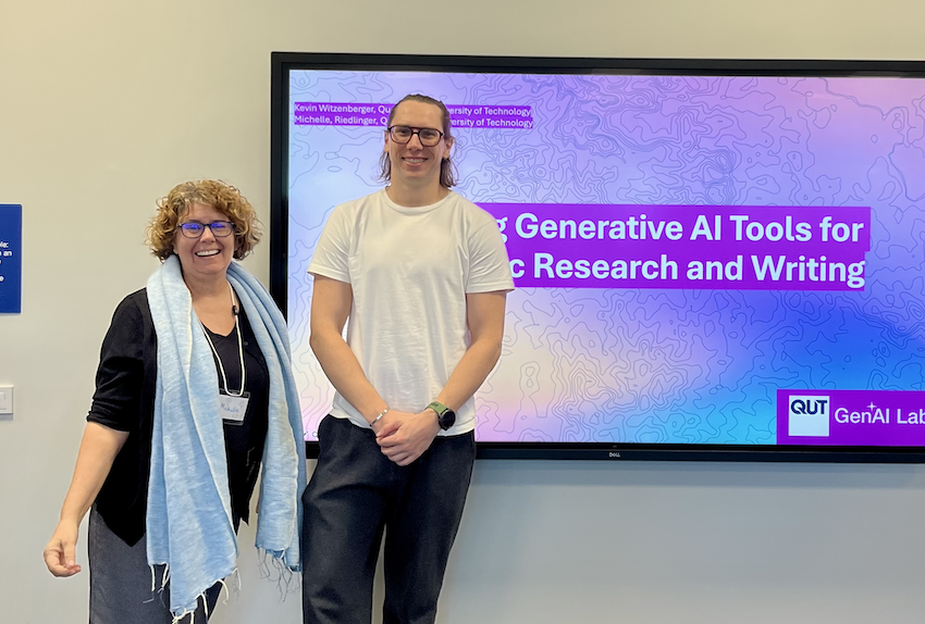 Kevin Witzenberger and Associate Professor Michelle Riedlinger from QUT ran a hands-on workshop at Research Bazaar Queensland on how to audit generative AI tools for academic research and writing.
