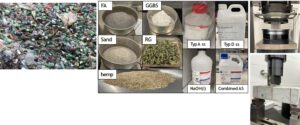 The effects of key parameters including binder ratio (0% FA 100% GGBS, 50% FA 50% GGBS and 100% FA 0% GGBS), silica modulus (2.0 and 2.5 ratios), curing regimes and curing periods on the mechanical properties of GPC are examined at the paste level. 100% GGBS paste specimens reach 61 MPa compressive strength at 28 days. At the mortar level, several variations are examined such as the influence of binder ratio, sand replacement with WG (10%, 15%, and 25% by weight) and hemp (1%, 1.5% and 2.5% by volume). The findings show 15% WG replacement increased its compressive strength up to 78% between 14 and 28 days. The use of hemp with up to 1.5 % replacement produced optimum strength, where higher percentages resulted in strength degradation.