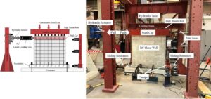 The QUT Banyo facility is equipped to test full-scale structures under cyclic in-plane and out-of-plane loads to mimic seismic effects. The facility uses a dual-purpose servo-controlled actuator with a 1000 kN capacity for in-plane cyclic displacement on walls. It has a strong floor where test specimens can be bolted down. For applying cyclic in-plane shear (push-pull) loads, the actuator is attached to a loading frame, and the load is applied to the top of the wall through a steel capping. Hydraulic jacks mounted on the loading frame’s top beam provide pre-compression to the wall. Three 100 kN hydraulic jacks are positioned on a distribution beam atop the wall to evenly distribute vertical loads, with steel roller bearings placed between the beam and the capping plate for in-plane shear loading.