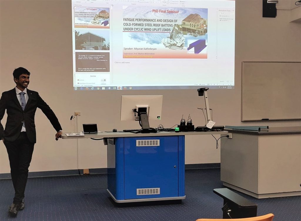 Myuran Kathekeyan successfully completed his final seminar. His topic of research is on the “Fatigue performance and design of cold-formed steel roof battens under cyclic wind uplift loads”. Congrats Myuran…..!!!!!!!