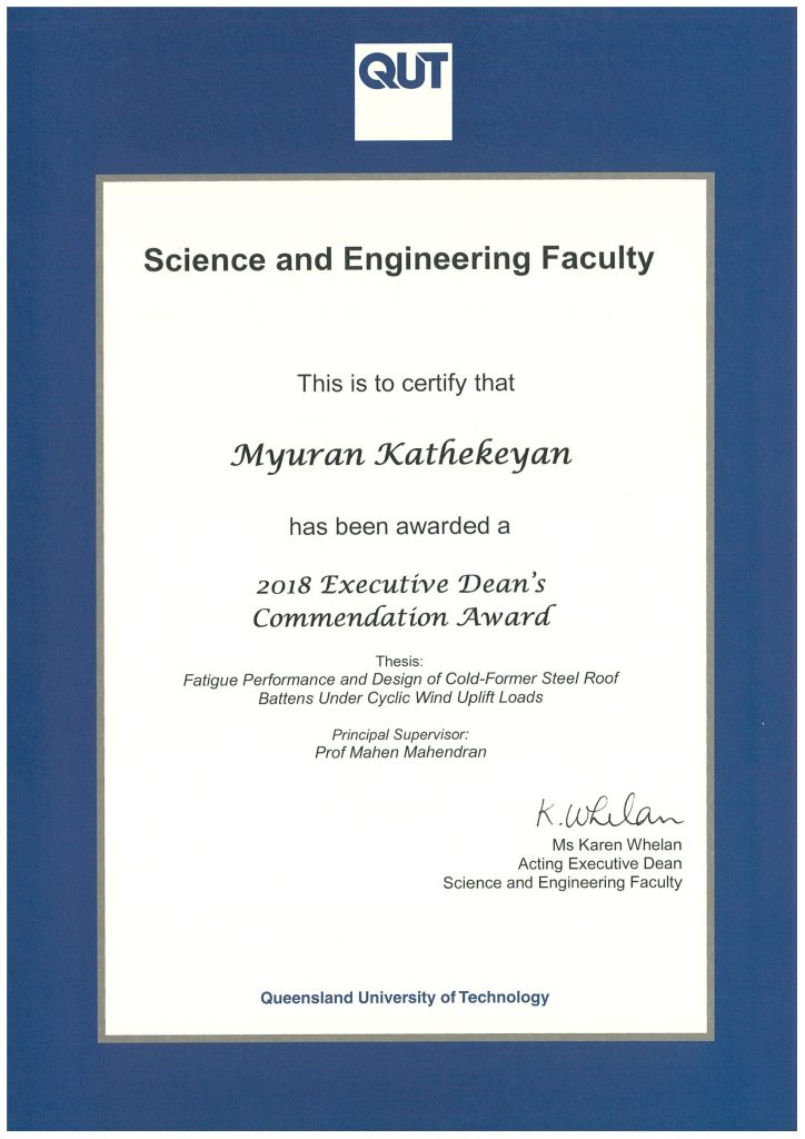 One more thesis award to the list. Congratulations Dr. Myuran Kathekeyan for receiving the Executive Dean’s Commendation Award on the thesis titled – “Fatigue Performance and Design of Cold-Formed Steel Roof Battens Under Cyclic Wind Uplift Loads”.