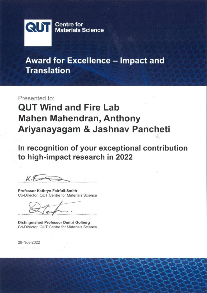 QUT Wind and Fire Lab was awarded in recognition of its exceptional contribution to high-impact research in 2022. Congratulations team!