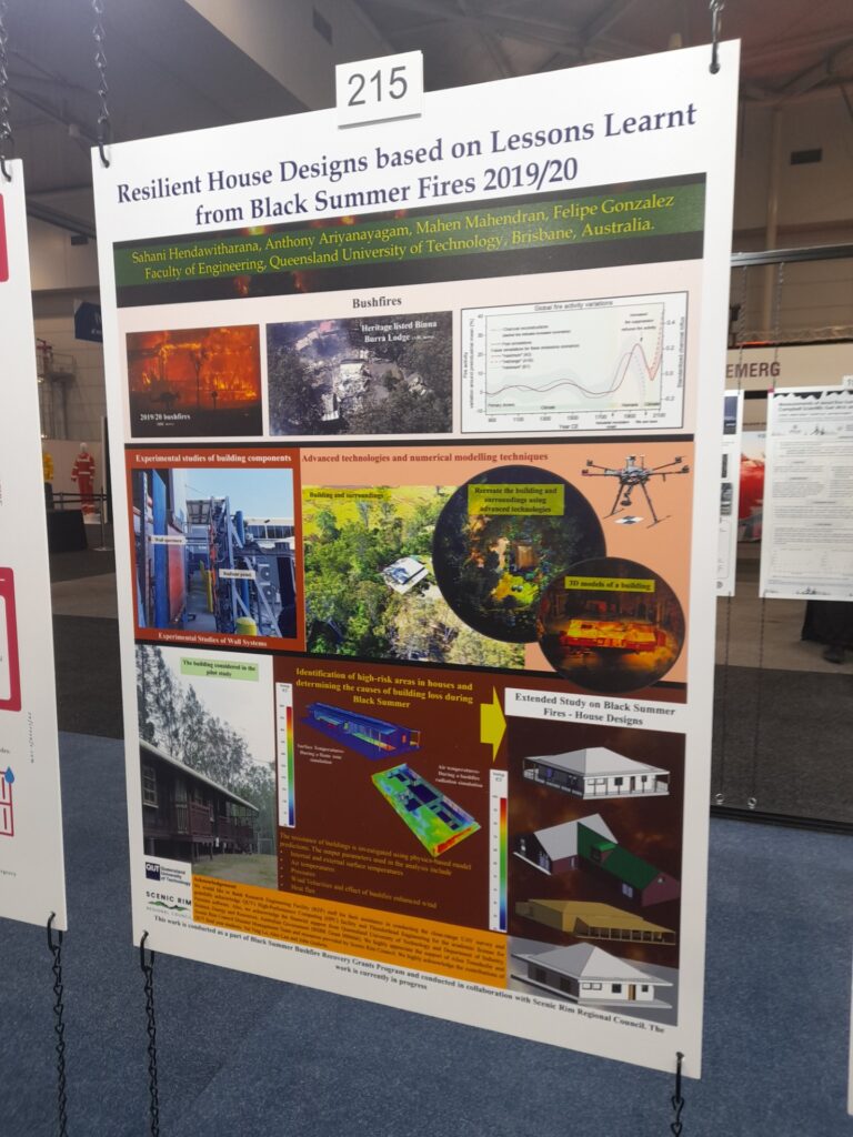 Our Poster titled “Resilient House Designs based on Lessons Learnt from Black Summer Fires 2019/20” by Dr Sahani Hendawitharana, Dr Anthony Ariyanayagam and Prof Mahen Mahendran was presented at the 2023 Institution of Fire Engineers (Australia) National Conference. The conference was held as a part of AFAC23 on 23-24 August 2023 in the Exhibition Hall of the Brisbane Convention and Exhibition Centre, with AFAC23 powered by INTERSCHUTZ Exhibition with over 200 leading industry exhibitors on display.
