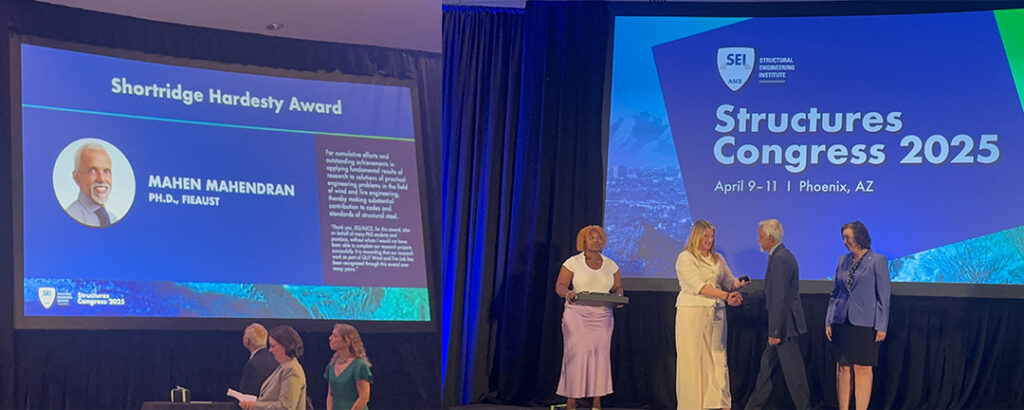 The ASCE Structural Engineering Institute has selected Professor Mahen Mahendran as the recipient of the 2025 Shortridge Hardesty Award. This prestigious lifetime achievement award is given annually to a world-leading researcher in the field of structural stability. Professor Mahendran is recognized for his outstanding contributions in applying fundamental research to practical engineering solutions in the fields of wind and fire engineering and for his substantial contributions to the codes and standards of structural steel.