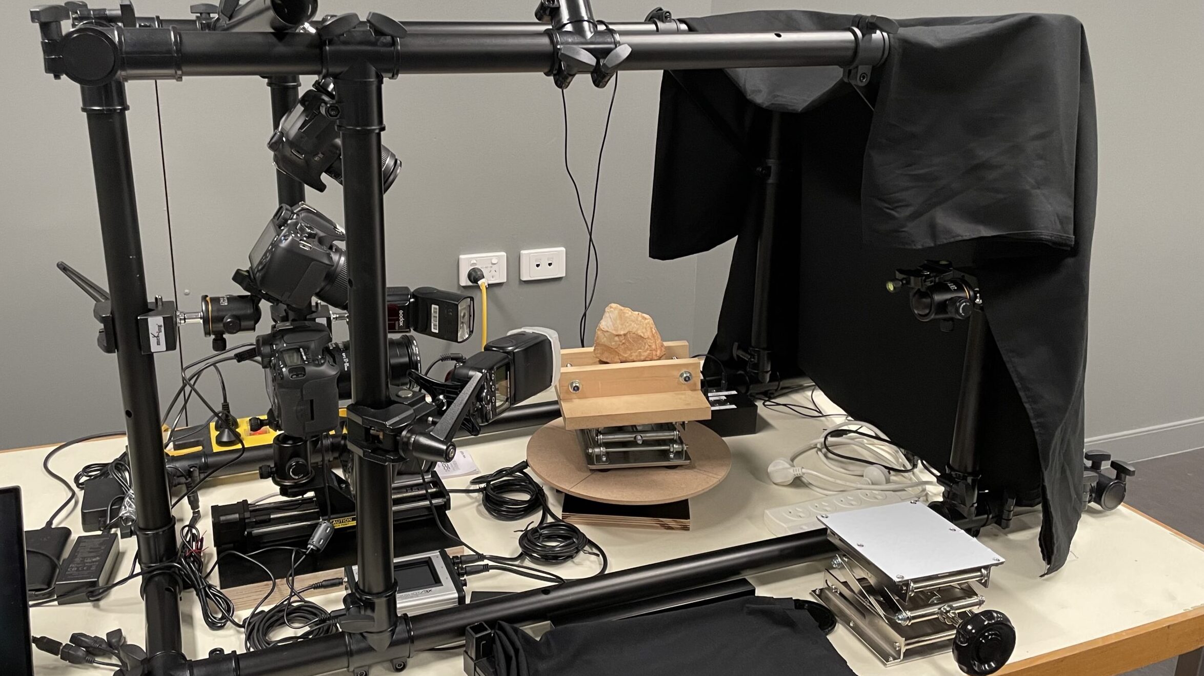 Most of the work I’ve done has deployed the rail for linear stacking plus a single turntable for object rotation. The controller enables us to set up the parameters and do all photography for a single ‘platter’ in one go. So, let’s say our object requires 10 images per linear stack and we decide to shoot every 5 degrees of arc, that will take around an hour to complete. Repeat that five more times with reorientation of the object in between takes and you’ll only get one item done in a standard working day. So you can see why the robot is a good idea… (learn more here…)