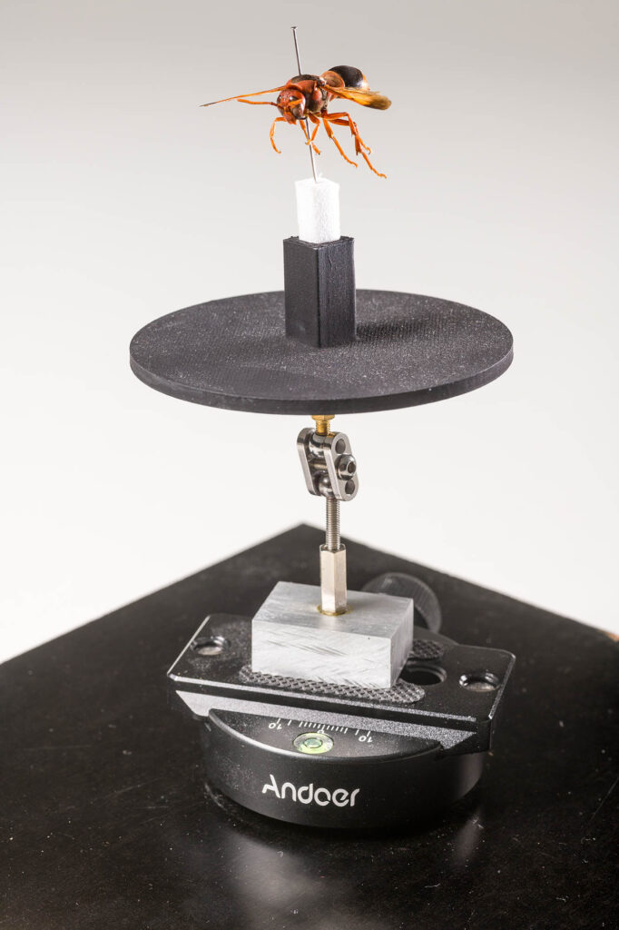 But many insects were mounted a long time ago and photogrammetry was not on the list of applications at that time. So the pin is not always positioned at the perceived centre of the creature. This means a mounting system that can easily accommodate small adjustments to positioning and angle is deeply useful. I’ve experimented long and hard with this and the current system uses a bespoke combination of 3D printing, stop-motion armature hardware, and COTS photographic clamp accessories. And it works! (learn more here…)